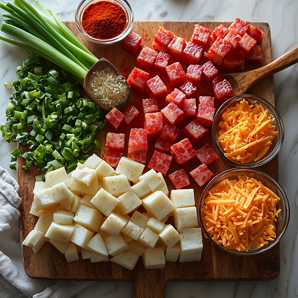 This Cajun Potato Soup Recipe relies on ingredients that are humble yet essential, each bringing a particular magic to the pot—whether it’s the smoky bacon that adds depth or the vibrant red bell pepper for a burst of color and sweetness.