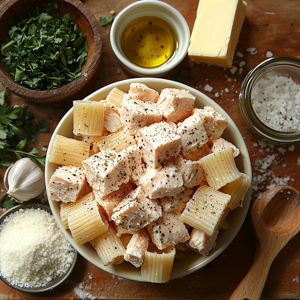 The beauty of the Creamy Garlic Chicken & Parmesan Pasta Delight Recipe lies in how straightforward and essential the ingredients are. Each one plays a vital role in building layers of flavor, from the juicy chicken to the silky sauce and cheesy finish. The simplicity ensures nothing overwhelms, allowing the fresh garlic, rich cream, and sharp parmesan to shine through.