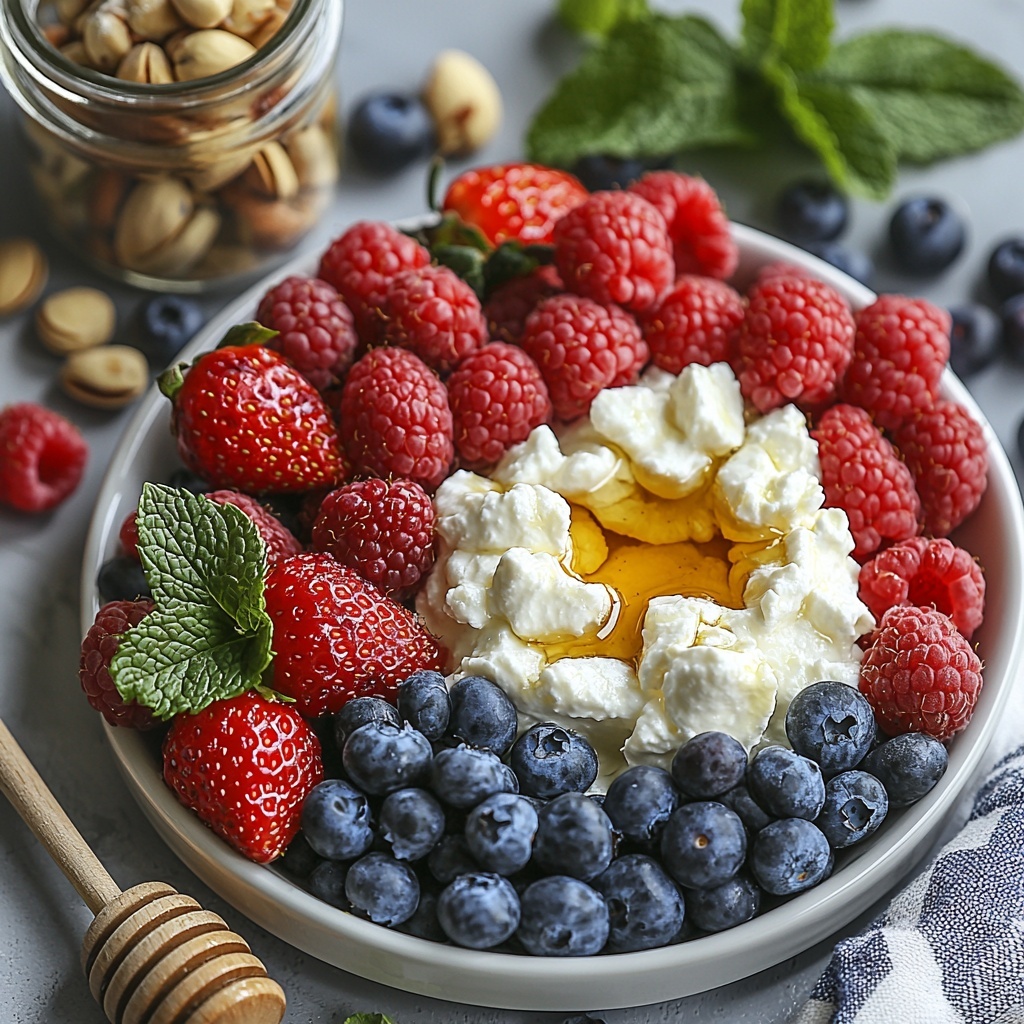 - Assemble the Dish: Drizzle the warmed honey over the whipped quark and Greek yogurt mixture, then layer the prepared strawberries, blueberries, and raspberries on top.