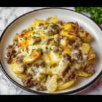 - Add the Beef and Cheese Mixture: Evenly spread half of the cooked ground beef over the potato layer. Pour half of the prepared cheese sauce evenly over the beef. Then sprinkle half of the shredded cheddar and mozzarella cheese on top.