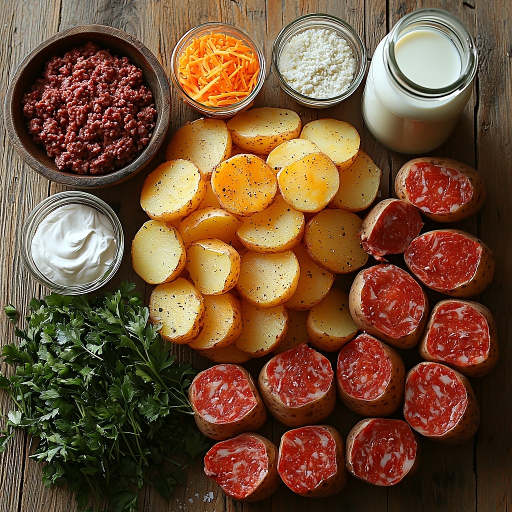 This Hamburger Potato Casserole Recipe relies on a handful of staple ingredients that work hand in hand to create a medley of flavors and textures. Each component plays a vital role, whether it’s the richness of cheddar cheese, the creaminess of sour cream, or the hearty base of ground beef, ensuring the dish feels both wholesome and indulgent.