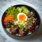 These Irresistibly Juicy Korean BBQ Meatball Rice Bowls offer a savory and satisfying meal combining tender homemade Korean BBQ flavored meatballs with fresh vegetables and perfectly cooked rice. Featuring a blend of ground beef and pork, aromatic garlic and ginger, and a rich soy-based BBQ sauce, these bowls are topped with crunchy shredded carrots, cabbage, sliced cucumber, and soft-boiled eggs for a balanced, flavorful, and wholesome dinner ready in under an hour.