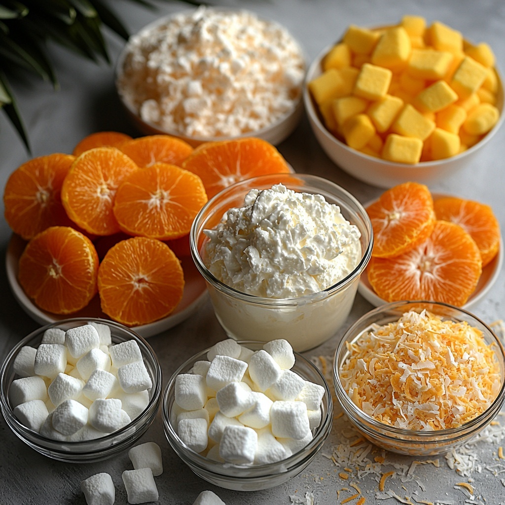 Gathering your ingredients for this Orange Fluff Salad Recipe is a breeze, and each one plays an essential role in creating that perfect balance of flavors and textures. From the creamy vanilla pudding base to the juicy mandarin oranges, every item contributes a unique touch that elevates this dish.
