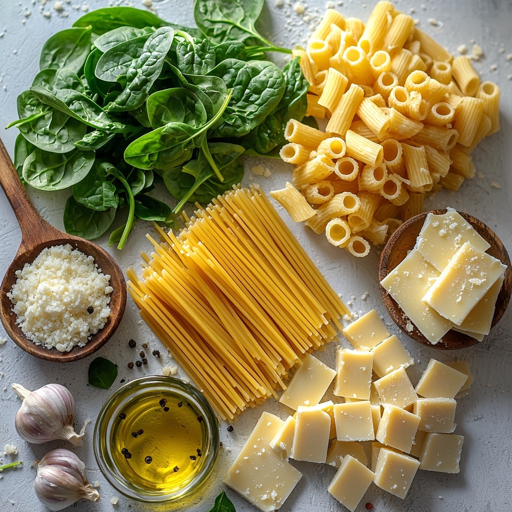 To create this delightful Pasta with Spinach Cream Sauce Recipe, you only need a handful of straightforward ingredients, each playing a crucial role in building the sauce’s creamy texture, bright flavor, and satisfying richness. These staples not only keep the dish approachable but also ensure every element complements the others perfectly.