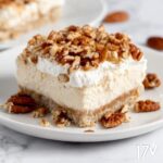 A luscious and creamy pecan cream pie featuring a crunchy graham cracker crust and a smooth, fluffy cream cheese filling folded with whipped cream, topped with crunchy pecans. Perfectly chilled for a refreshing dessert that combines sweet and nutty flavors in every bite.