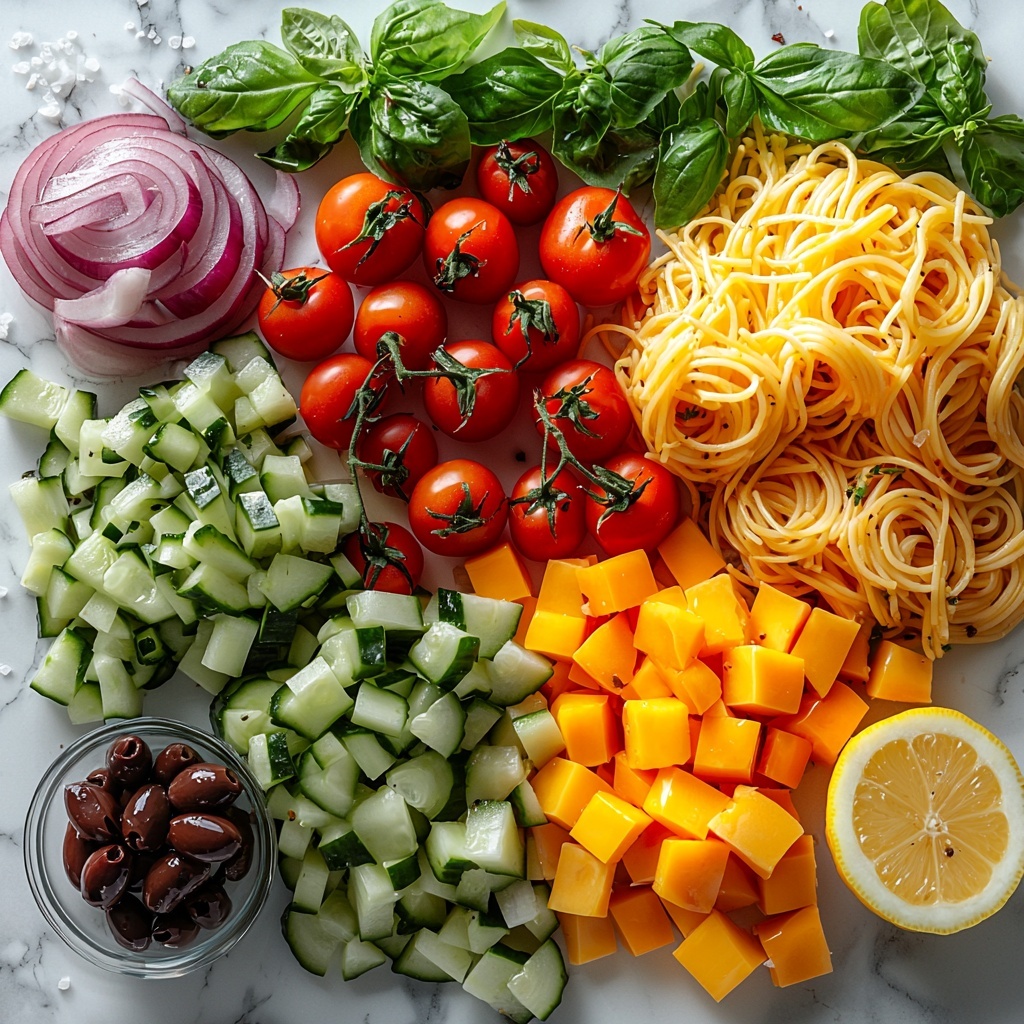 While the spaghetti chills, dice the green and red bell peppers, finely chop the red onion, slice the cucumber, and halve those juicy cherry tomatoes. In a large bowl, combine all the fresh vegetables with the sliced black olives and cubed cheddar cheese. This mixture is where the crunchy, creamy, and tangy elements come together to make this salad truly special. The colorful medley is already a feast for the eyes and taste buds!