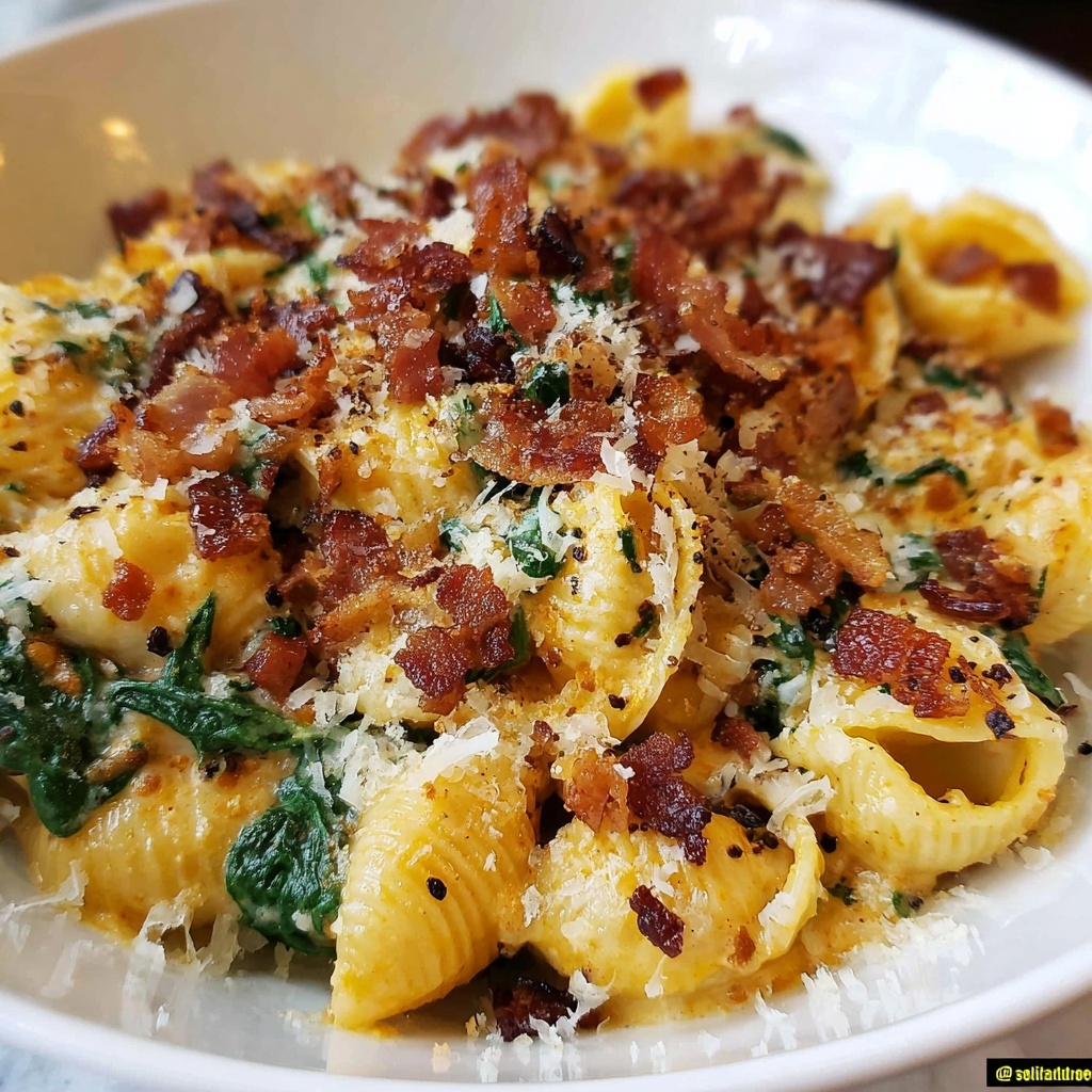 Dish it out warm and get ready to savor the comforting blend of creamy pumpkin, smoky bacon, melted cheese, and fresh spinach. This dish is guaranteed to become a new favorite at your table.
