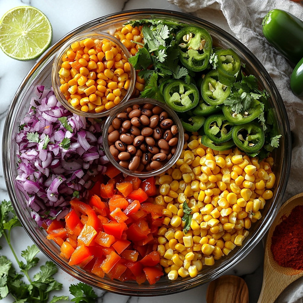 In a large mixing bowl, combine the black eyed peas, black beans, corn, finely diced bell pepper, red onion, and jalapeños. This is where your dip starts to come alive with color and texture. Give it a gentle toss to evenly distribute all the vibrant ingredients before moving to the dressing.