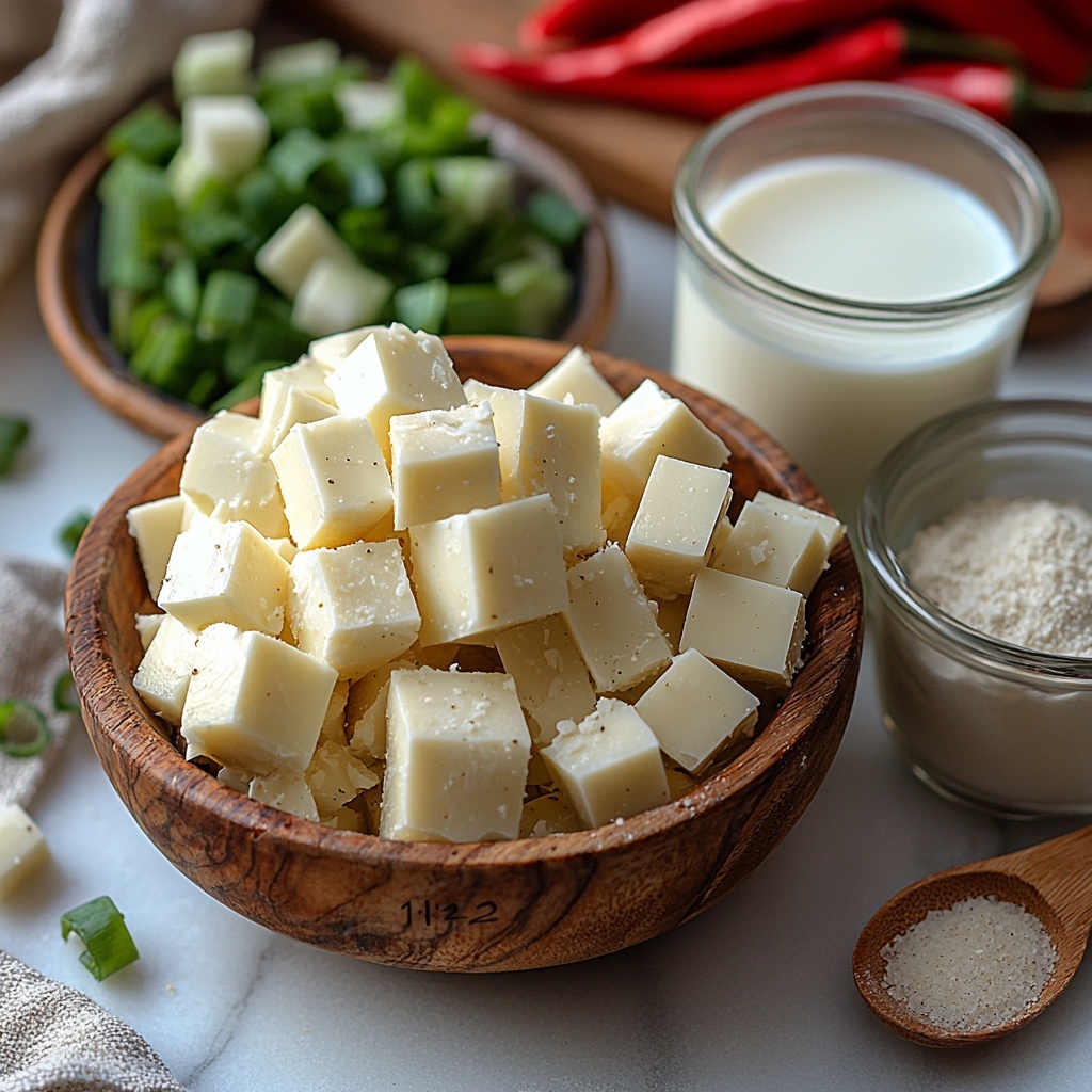 Start by gathering all your ingredients so everything is within arm’s reach. Chop the white American cheese into smaller chunks to help it melt evenly and quickly, preventing any clumps in your dip.