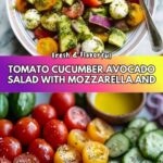 A fresh and vibrant Tomato Cucumber Avocado Salad featuring sweet cherry tomatoes, creamy avocado, crisp cucumber, and soft mozzarella balls, all tossed in a flavorful basil pesto and lemon dressing. Perfect for a light lunch or a colorful side dish.