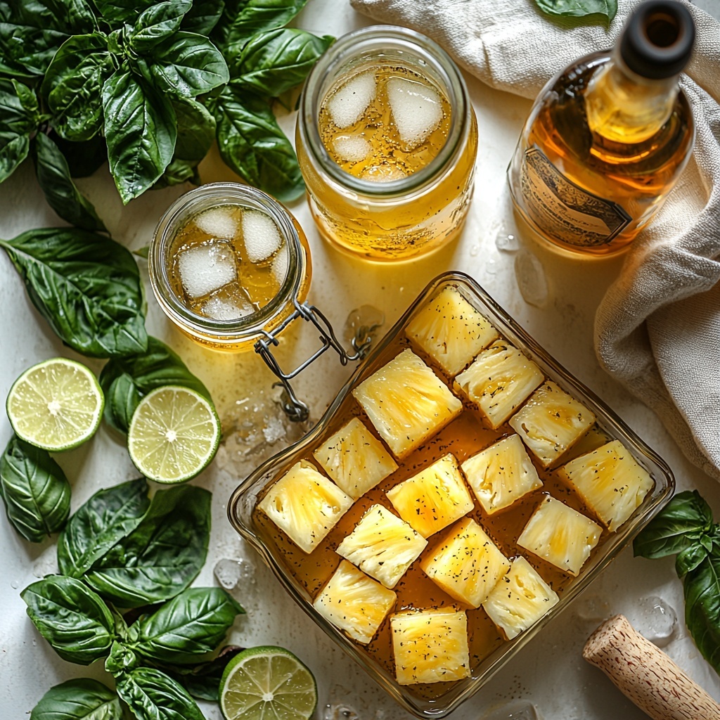 Start by adding the cubed pineapple, lime slices, fresh basil leaves, basil infused simple syrup, and pineapple rum to a large pitcher. Stir everything together gently so the fruits and herbs mingle with the syrup and rum. Cover the pitcher and let it chill in the refrigerator for at least four hours—this resting time lets all those fabulous flavors marry and intensify beautifully.